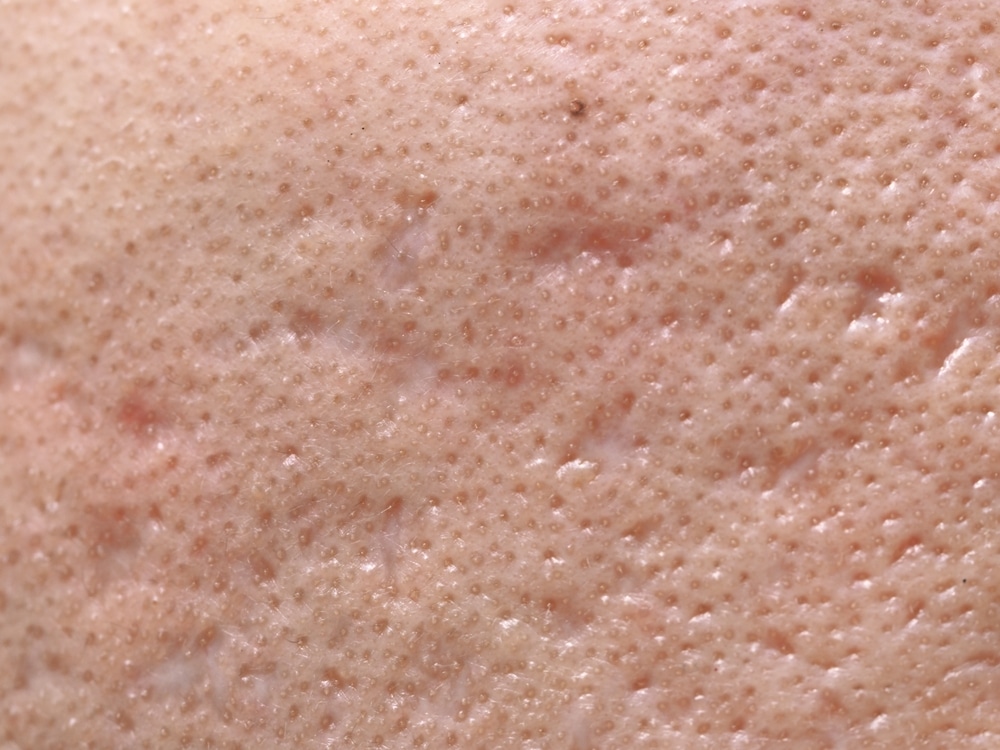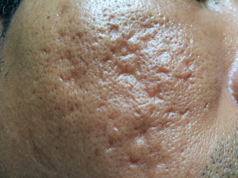 มีลักษณะเป็นหลุมเล็กๆบนผิว ทำให้ผิวขรุขระไม่เรียบเนียนหรือเป็นรอยบุ๋มลงไป เมื่อเทียบกับผิวหนังข้างเคียงมองเห็นเป็นหลุมลึกแบบชัดเจน บางคนอาจจะกระจายทั่วใบหน้า หรือบางคนมีเป็นจุดๆ เป็นหลุมแผลเป็นทิ้งไว้บนใบหน้า ทำให้ใบหน้าดูไม่สดใส หน้าโทรมและรักษาได้ยากกว่าปัญหาสิว