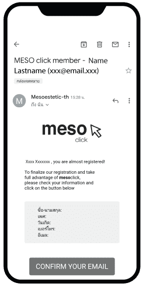 เมื่อขอมูลเรียบร้อยแล้ว กดยืนยันข้อมูลถูกต้อง ก่อนกดยืนยันกรุณาตรวจสอบข้อมูลให้ถูกต้อง วันเกิดและe-mail จะไม่สามารถแก้ไขได้ ในกรณีต้องการแก้ไข กรุณาติดต่อ admin ผ่าน Line @mesoestetic